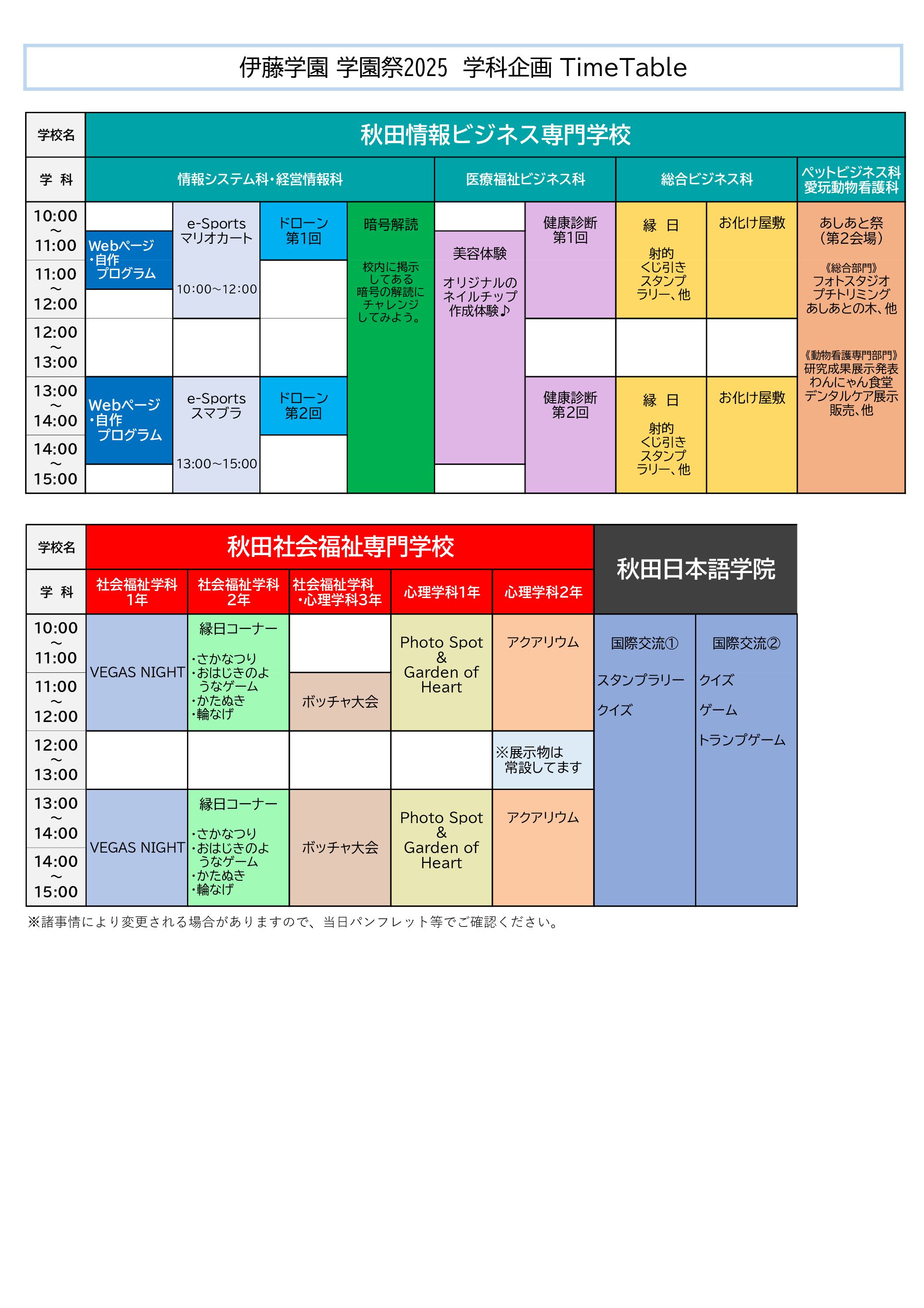 伊藤学園の学園祭は、 秋田情報ビジネス専門学校・秋田社会福祉専門学校・秋田日本語学院の3校合同で開催します。