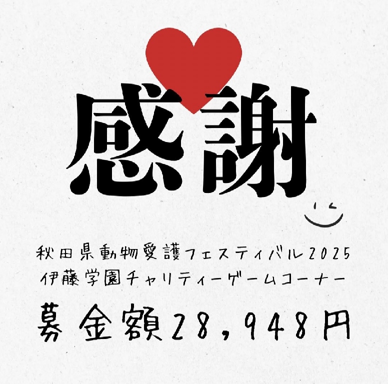 伊藤学園チャリティーゲームに、参加費として募金を賜り誠にありがとうございました。🍀募金合計金額🍀🍀…28948円…🍀皆様の温かなお気持ちを、お預かりさせていただきました。心より御礼申し上げます。お預かりいたしました募金は、これから担当者で話し合いを行い、寄付先を決定させていただきます。決定し、寄付を行いましたら、また改めてご報告させていただきます。本校の里っこ活動においては、ファミリー支援(卒業動物への医療・物資支援)も行っておりますが、これは、イベント売上に利益が発生する際に行っているものです。皆様からお寄せいただきました“募金”は、学外の保護団体様へと全額寄付させていただきますことを申し添えさせていただきます。皆様の温かく優しいお気持ちは、必ず、今なお命を繋ぐことを必要としている現場へと、届けさせていただきます。今後もこの活動を見守っていただけますと幸いです。学校法人伊藤学園秋田情報ビジネス専門学校愛玩動物看護科・ペットビジネス科学生、教職員一同