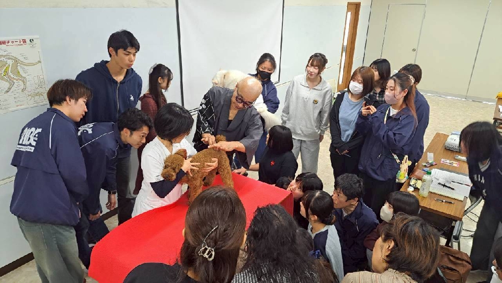 しかし、わんちゃんや猫ちゃんのように毛に覆われた動物さんのツボを見つけるのは意外と難しく…💦「このあたりかな?」「ちょっとズレてるかも…」と悩みながら、真剣な表情で探す学生の姿が印象的でした😌