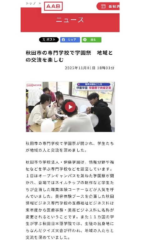 2025年11月1日(土)に開催された伊藤学園の学園祭の様子が、AABニュースで放送されました!🎉